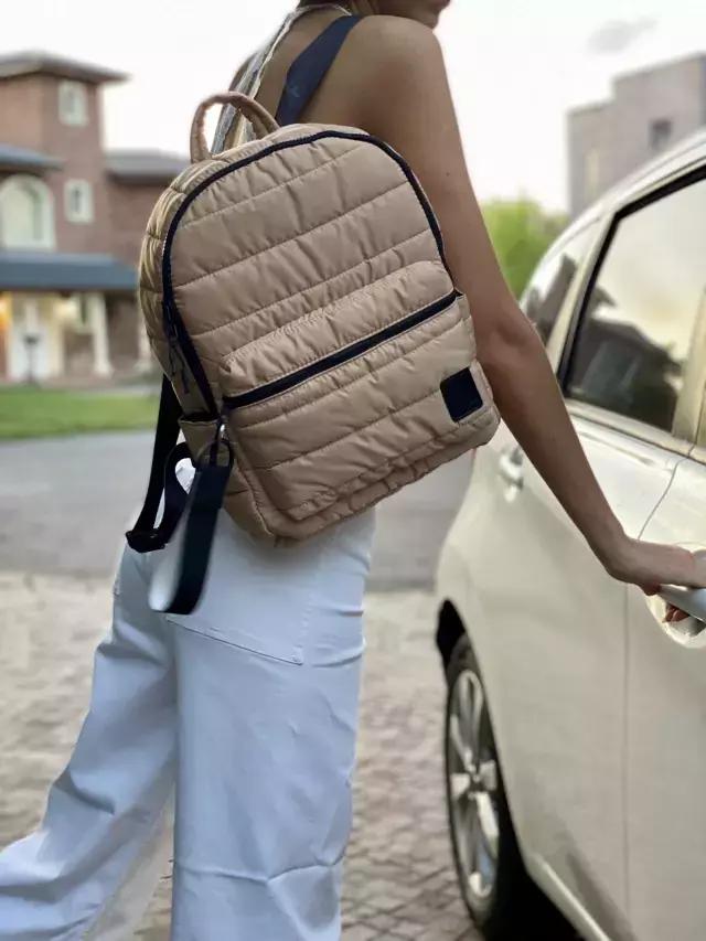 Mochila confeccionada en tela sire matelasseado, con cinta siblimada y cierres diente de perro.