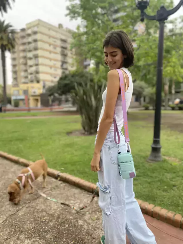 Porta Celu confeccionado en tela sire matelasseado, con cinta sublimada desmontable y cierres diente de perro.